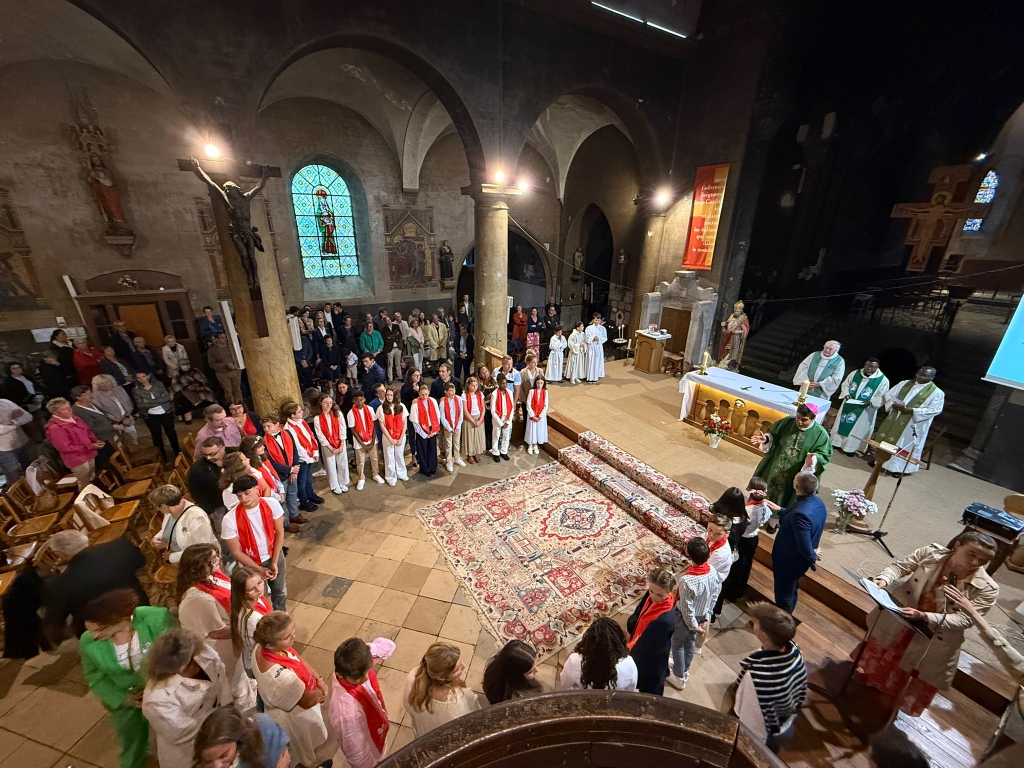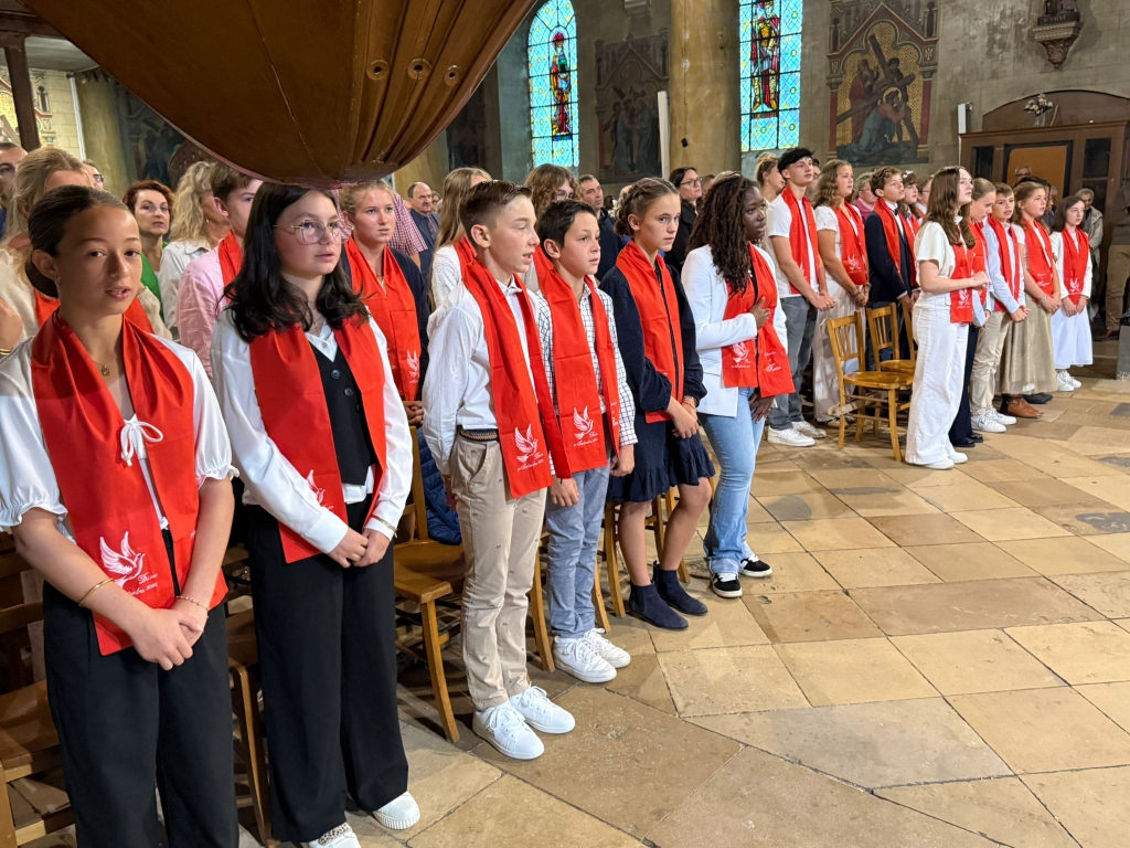 « Souffle imprévisible, Esprit de Dieu… ». Une étole rouge autour du cou symbolisant le feu de l’Esprit-Saint, avec leur nom et la date inscrits sur les pans, les vingt-cinq confirmands s’avancent. Pour moitié ils ont suivi le catéchisme dans la paroisse, et pour moitié au collège Sainte-Marie de Decize. Tous, après l’homélie, répondront avec conviction « Me voici ! » à l’appel de l’évêque, Mgr Grégoire Drouot. Inès, Cécilia, Kessy, Agathe, Margaux, Axel, Gabin, Pierre, Louise, Hélène, Nora, Léanore, Sanidjee, Tiphaine, Eugénie, Philippine, Arthur, Anthyme, Baptiste, Clémence, Maeva, Aimie, Léane, Briséis et Ewan : pour entourer cette belle brochette de confirmands, le père Jean Bosco, curé de la paroisse, le père Jean Raffegeau et le diacre Alain Joliet secondaient notre évêque, ainsi que le père Guy Richard, installé en ce mois de septembre dans la paroisse Saint-Jean-en-Sud-Nivernais.