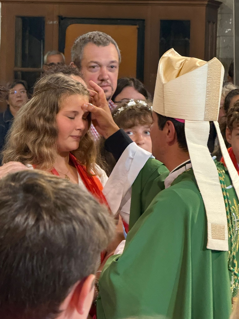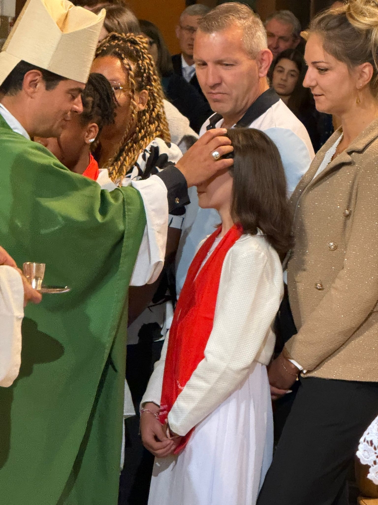 Il était alors temps de dire notre Credo, à travers la réponse aux trois questions des cérémonies solennelles, posées d’abord au père Guy Richard qui rejoint la paroisse, puis aux confirmands, puis à toute l’Assemblée. « Esprit de Lumière, Esprit créateur … ». Puis ce fut le moment de la Confirmation. Monition de l’évêque, imposition des mains en silence… les parrains et marraines s’approchent pour assister les confirmands tandis que l’évêque leur impose tour à tour l’onction du Saint-Chrême.